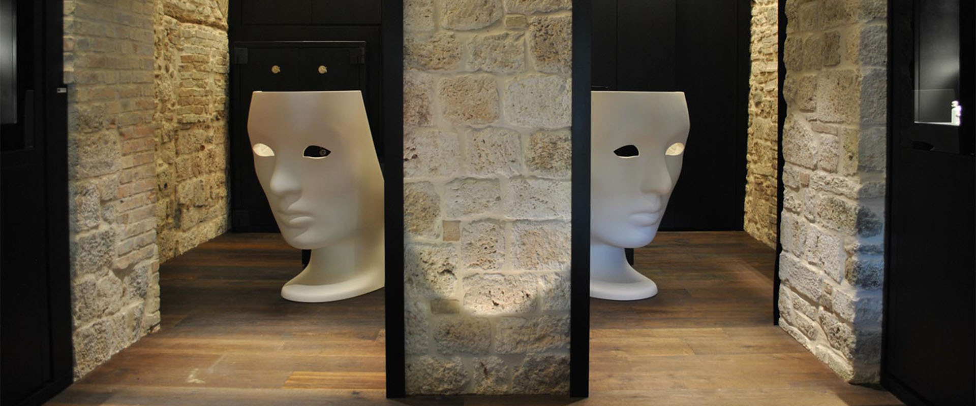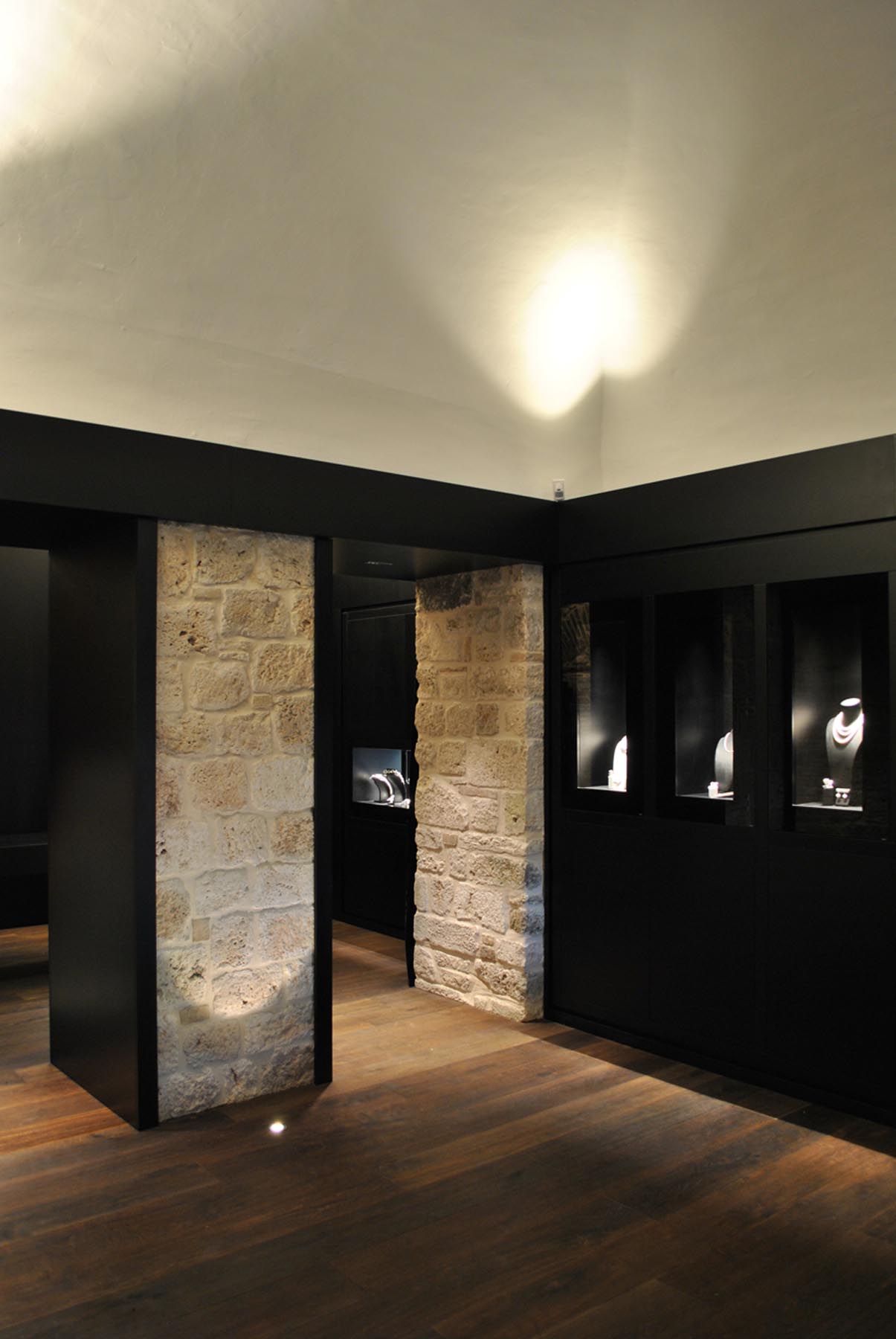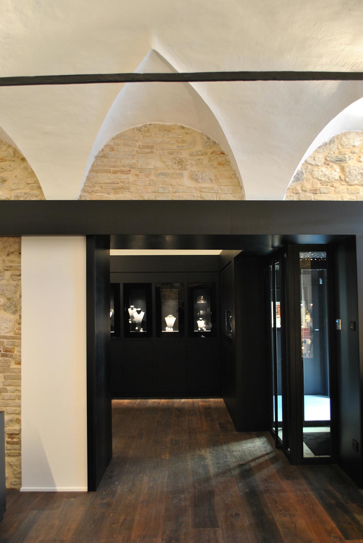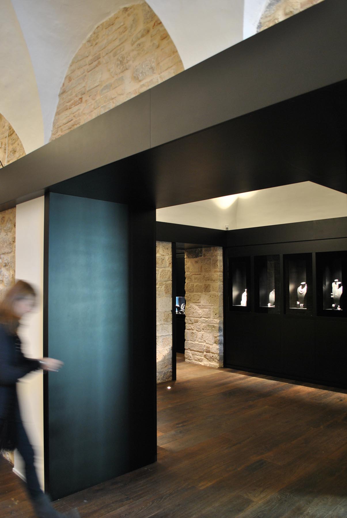 The identity of the space is played on strong material contrasts: dark surfaces, punctual lighting and minimal furniture enhance the display of jewellery.