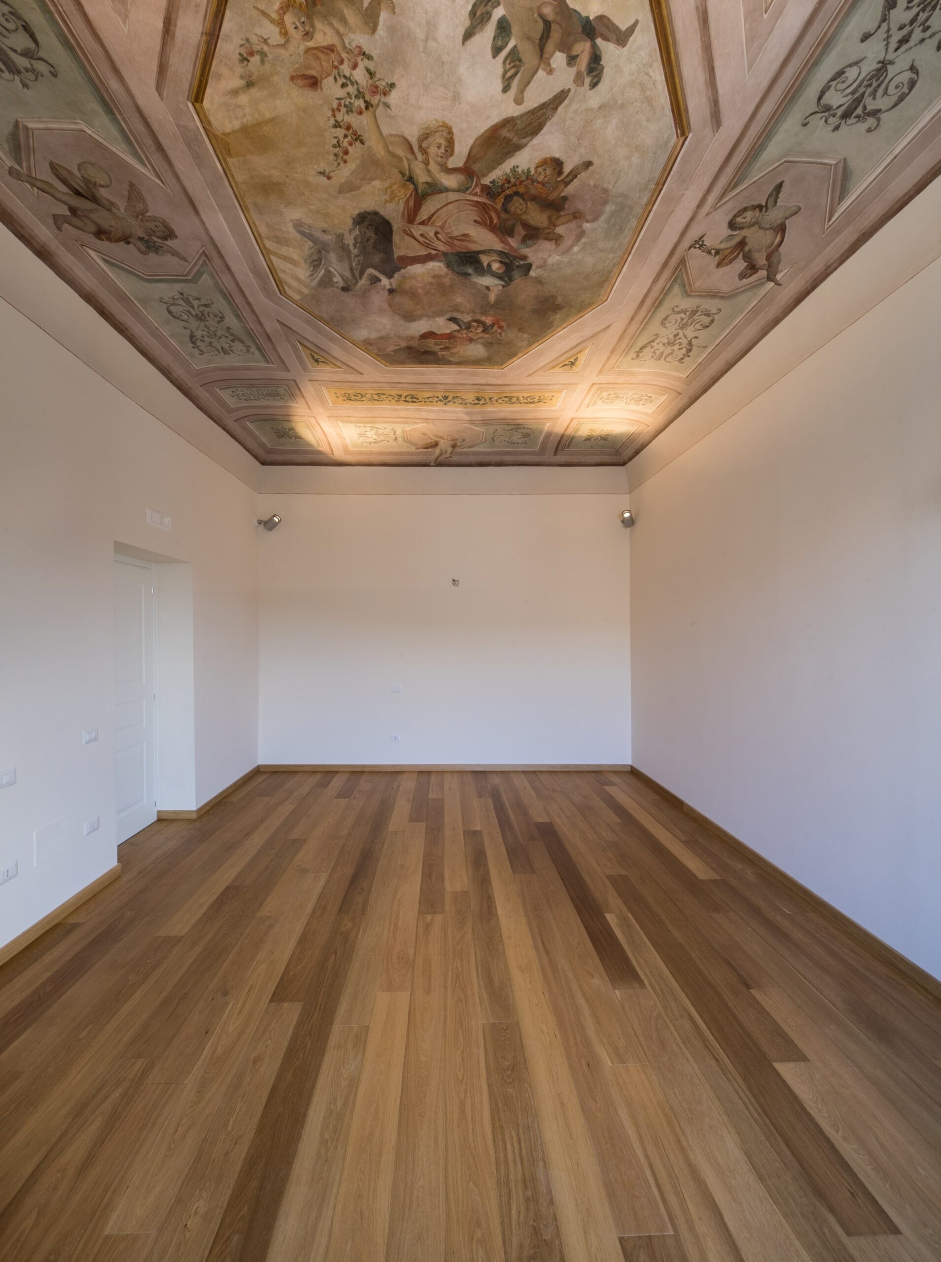 The interiors, finished with Remis colour Oak parquet from the Luce collection, elegantly interpret the architectural beauty of the past in a contemporary key. On an area of 140 square metres, the oak planks give warmth, balance and material value to the spaces.
