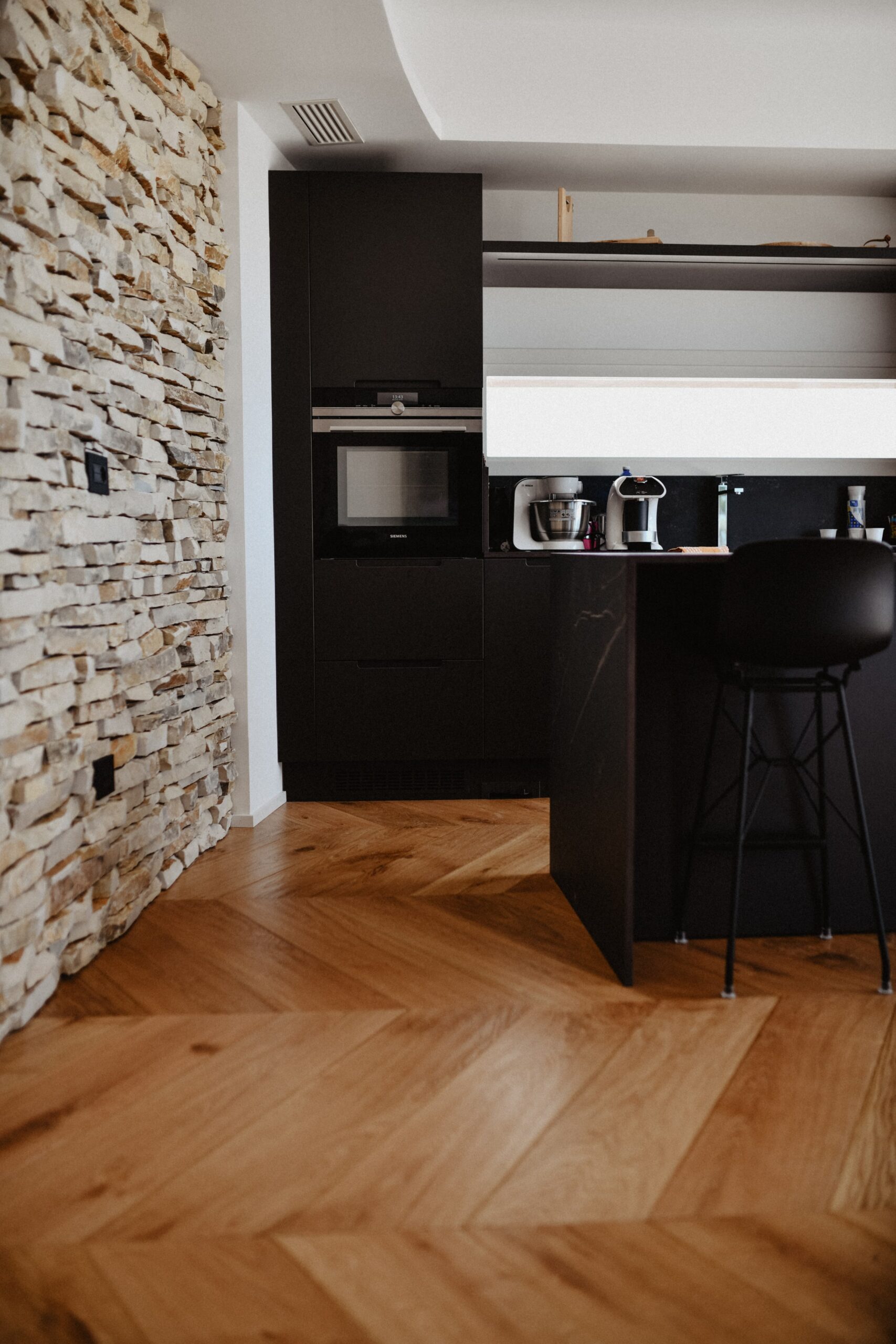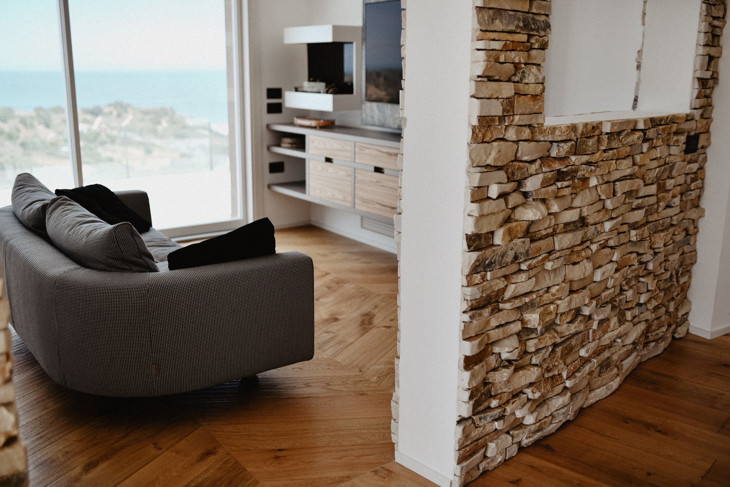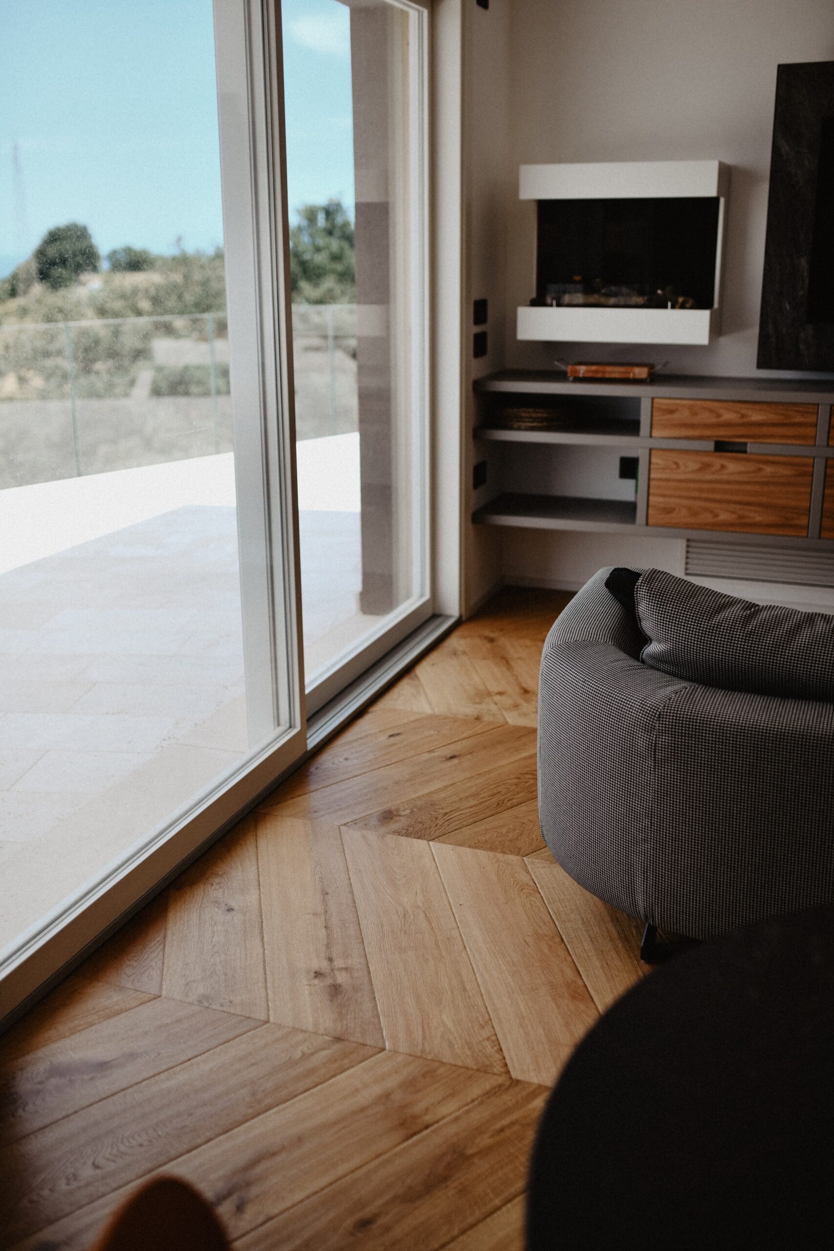 Wide planks give visual continuity and warmth to the main spaces, while the regular spine elegantly defines the living area. An interplay of geometries and finishes accompanies every step with naturalness and character.